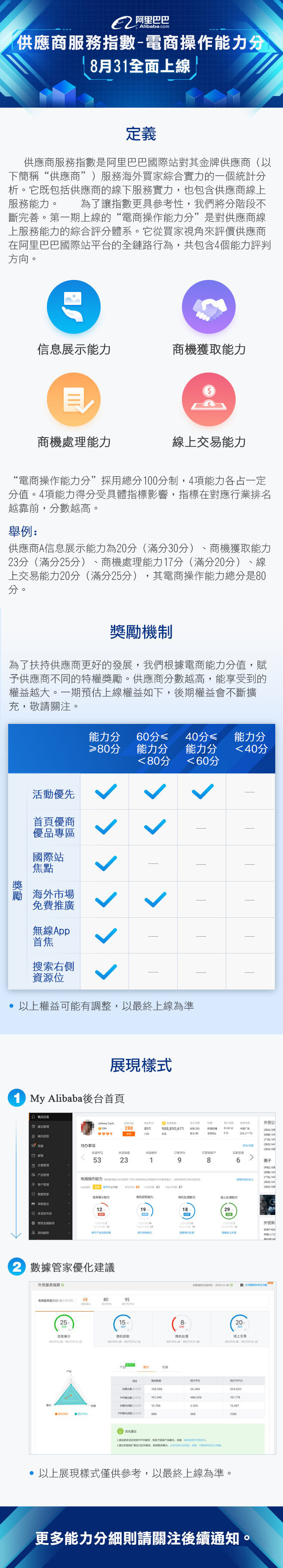 電商操作能力分的高低展示供應商服務買家的能力水準,高分供應商的商品轉化更高,進而可以在平台獲取更多曝光和資源。